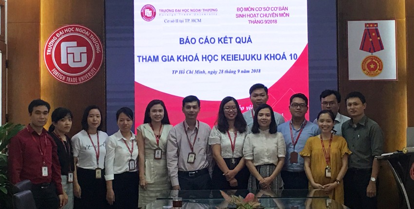 Thực hiện chủ trương tăng cường kiến thức thực tiễn vào bài giảng và phát triển hoạt động nghiên cứu khoa học, ngày 28/9/2018, Bộ môn Cơ sở - Cơ bản đã tổ chức buổi sinh hoạt chuyên môn với chủ đề: “Báo cáo kết quả tham gia khoá học Keieijuku khoá 10” với phần báo cáo của ThS Lý Ngọc Yến Nhi và ThS Nguyễn Văn Tiến (Giảng viên Bộ môn Cơ sở - Cơ bản).