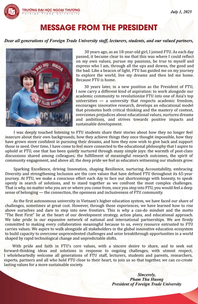 With pride and faith in FTU’s core values, with a sincere desire to share, and to seek out forward-thinking ideas and solutions in response to ongoing challenges, with utmost respect, I wholeheartedly welcome all generations of FTU staff, lecturers, students and parents, researchers, experts, partners and all who hold FTU close to their heart, to join us so that together, we can co-create lasting values for a more sustainable society.