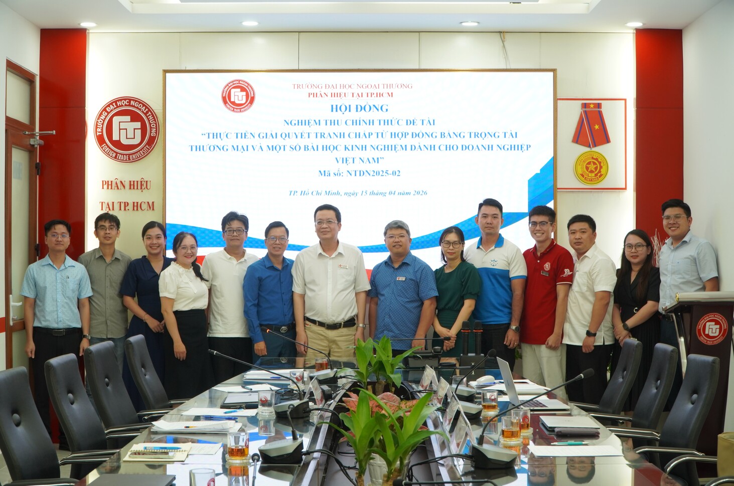 On April 15, 2026, at the Foreign Trade University – Ho Chi Minh City Branch, the Official Acceptance Council Meeting was held for the institutional-level science and technology research project entitled “Practical Dispute Resolution from Contracts through Commercial Arbitration and Lessons Learned for Vietnamese Businesses” (Project Code: NTDN2025-02), led by Assoc. Prof. Dr. Nguyen Xuan Minh.