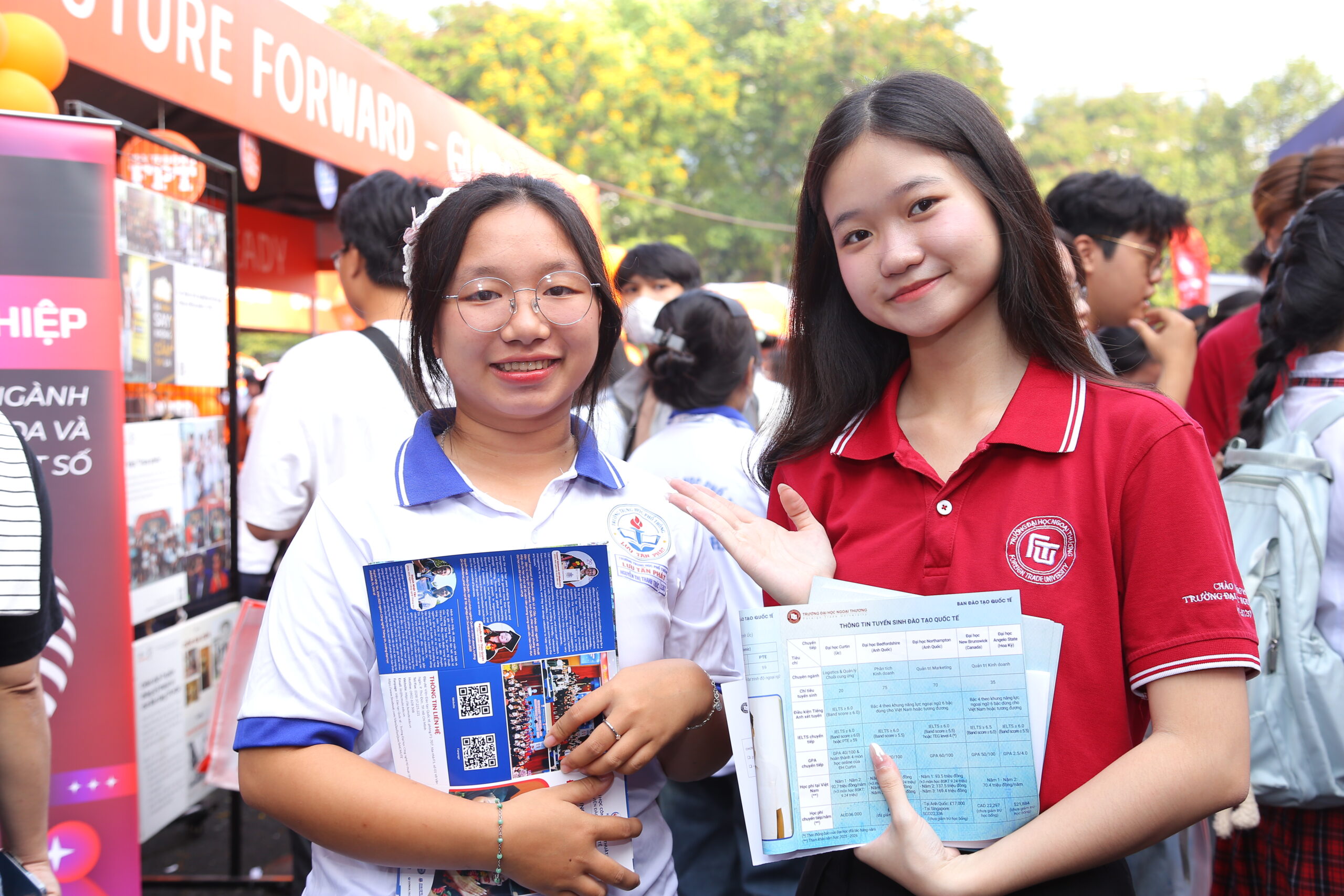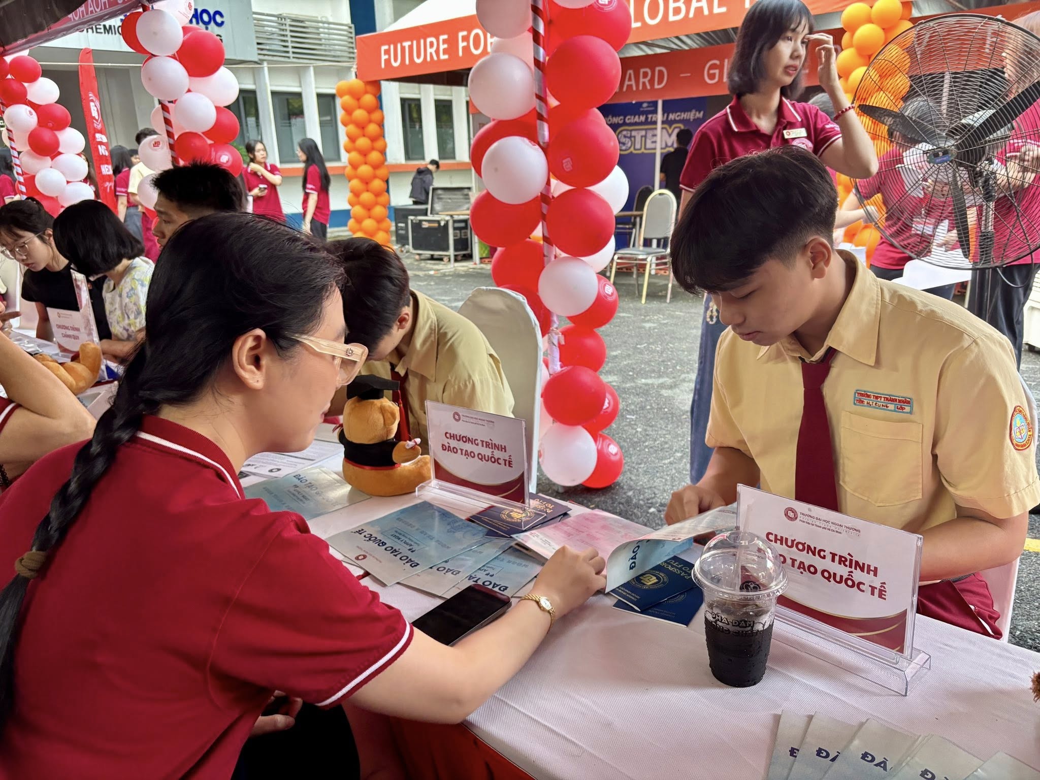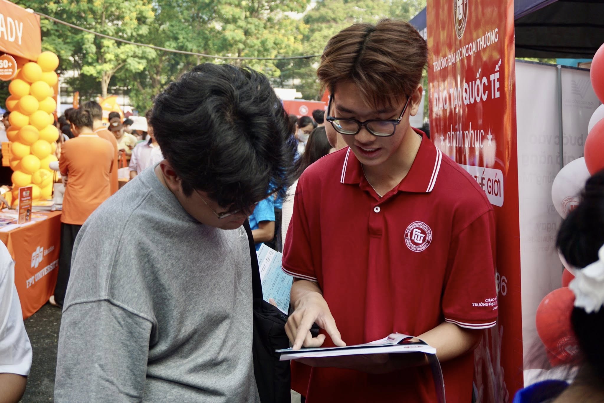 Trong suốt thời gian diễn ra ngày hội, gian hàng Đào tạo quốc tế của Phân hiệu Trường Đại học Ngoại thương tại TP.HCM luôn nhộn nhịp với sự tham gia của đông đảo các bạn học sinh THPT. Nhiều bạn đã chủ động trao đổi trực tiếp với quý thầy cô để tìm hiểu kỹ hơn về chương trình đào tạo, điều kiện tuyển sinh, lộ trình học tập cũng như cơ hội chuyển tiếp và nhận bằng từ các trường đại học đối tác quốc tế. Không khí tư vấn diễn ra cởi mở và sôi nổi khi các bạn học sinh liên tục đặt câu hỏi về ngành học, môi trường học tập và cơ hội nghề nghiệp sau khi tốt nghiệp. Thông qua những cuộc trao đổi trực tiếp này, nhiều bạn đã có thêm góc nhìn rõ ràng hơn về định hướng học tập trong môi trường quốc tế và lựa chọn ngành học phù hợp với bản thân.